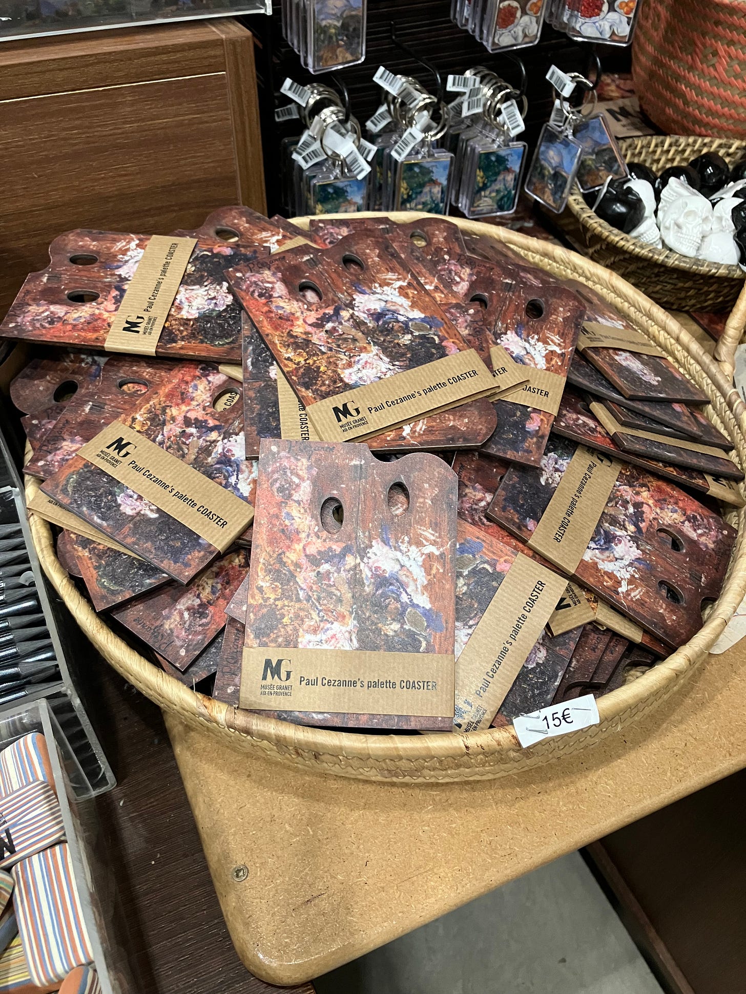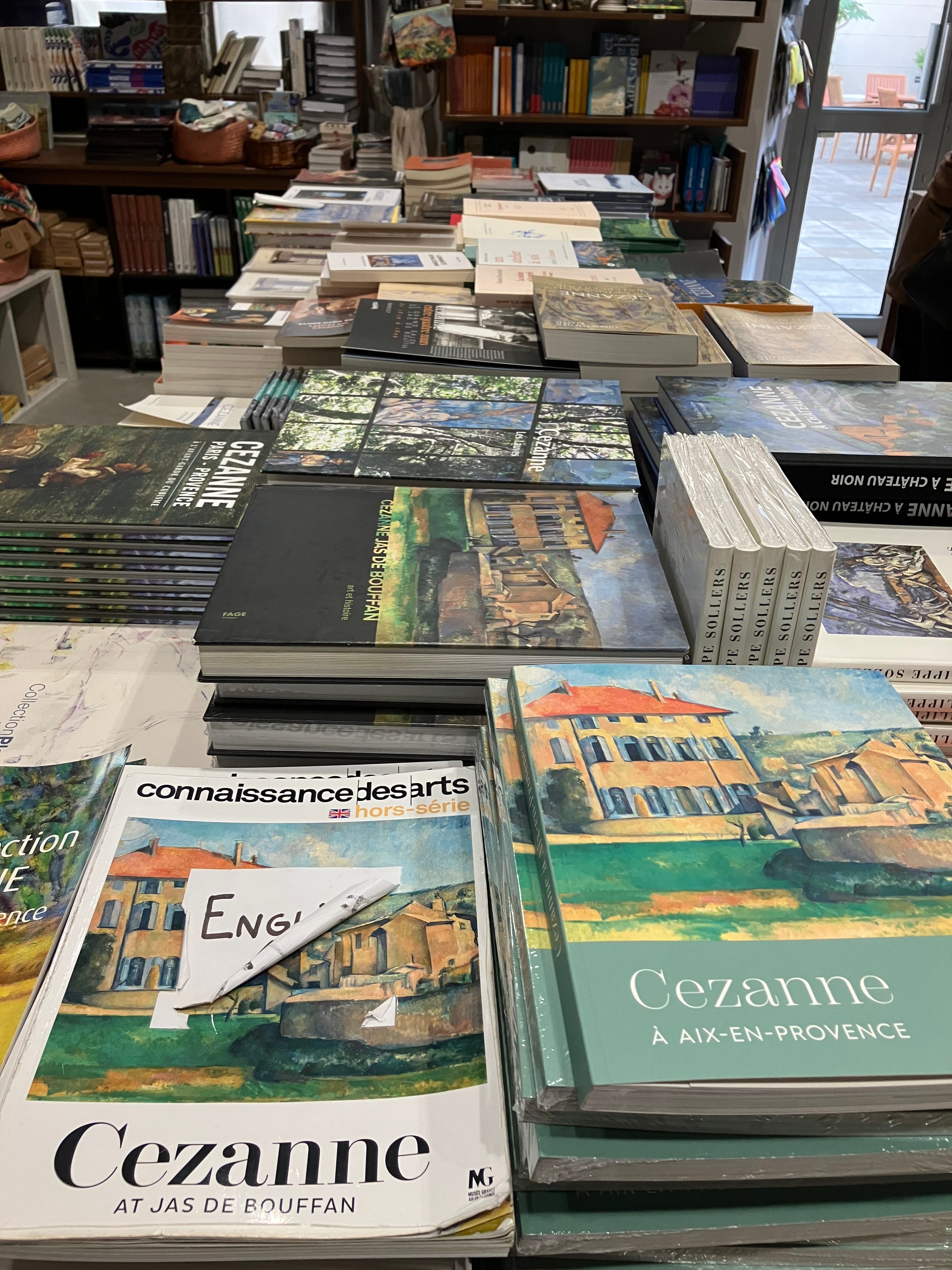 Cézanne, like other painters of his generation, worshipped Delacroix just as Planque and his contemporaries idolized Cézanne. This tradition of reverence for artists of the past is still evident today. Not only do hundreds of people flock to see Cézanne’s paintings, they can also view the ephemera from his life. Another museum in Aix features Cézanne’s studio while the Granet hosts Cézanne’s painting palette reverently displayed like a holy relic in a glass vitrine. Downstairs, in the gallery shop, this same palette has been transformed into a plethora of mementos — key chains, fridge magnets, coasters, and even a useable painting palette. A table full of books stretching the length of the shop further affirms the importance and sanctity of Cézanne and his work.